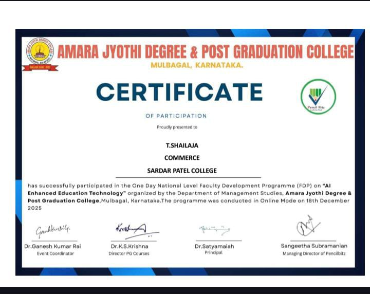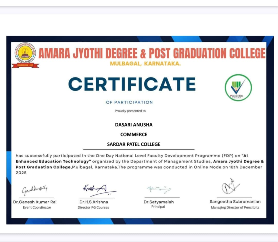 Mr. D. Sridhar Babu, the Chief Guest, addressed the gathering and expressed his pleasure in being part of this important occasion. In his speech, he emphasized the importance of quality education in the field of commerce and its crucial role in the nation’s economic development. He applauded Sardar Patel College for its efforts to provide state-of-the-art facilities and a conducive learning environment for its students.