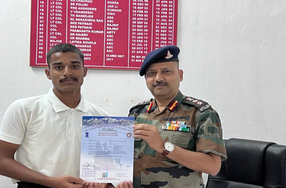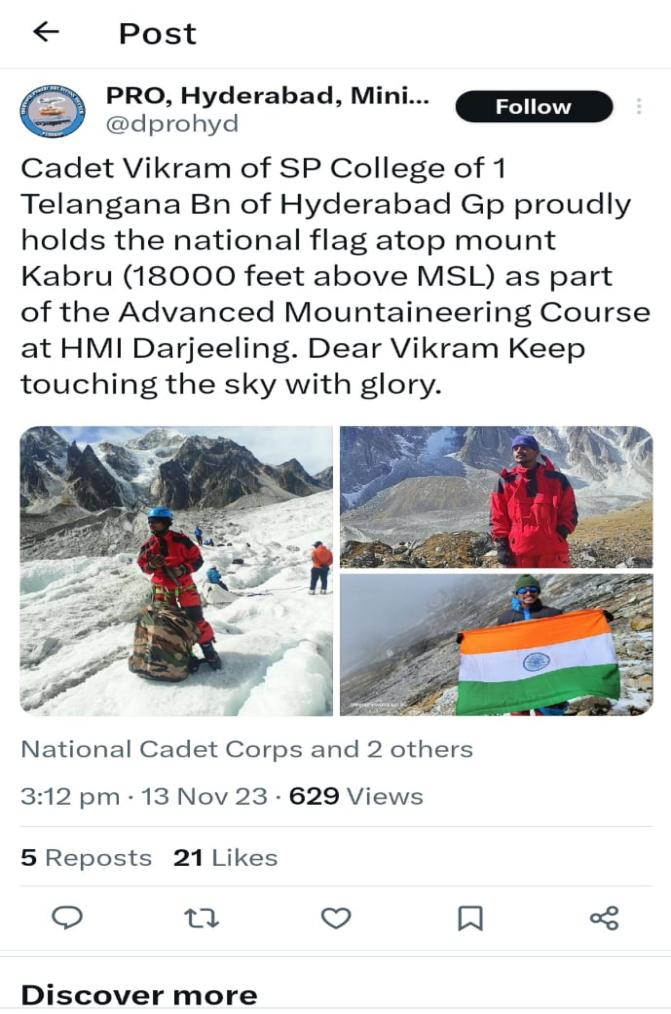 "One of our cadets, Cdt. Vikram, has successfully completed his Advanced Mountaineering Course at HMI, Darjeeling, from 19-10-2023 to 15-11-2023. He proudly hoisted our National Flag atop Mount Kabru, at 18,000 feet above MSL, as part of his course."
