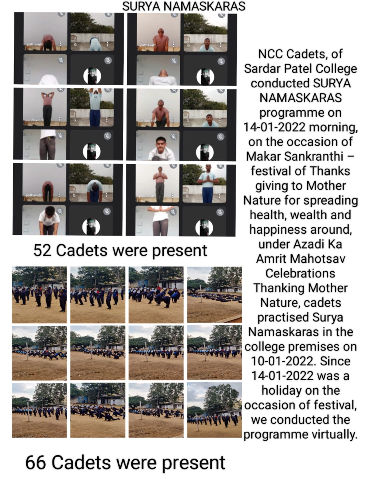 "In coordination with 1(T) BN NCC, Sardar Patel College, and New Government Degree College, a program was conducted at New Government Degree College, Khairatabad, on 21-06-2024. Twenty-six cadets from Sardar Patel College, 3/1 Coy, 1(Telangana) Battalion, Hyderabad Group, AP & T NCC Directorate, participated in the program."