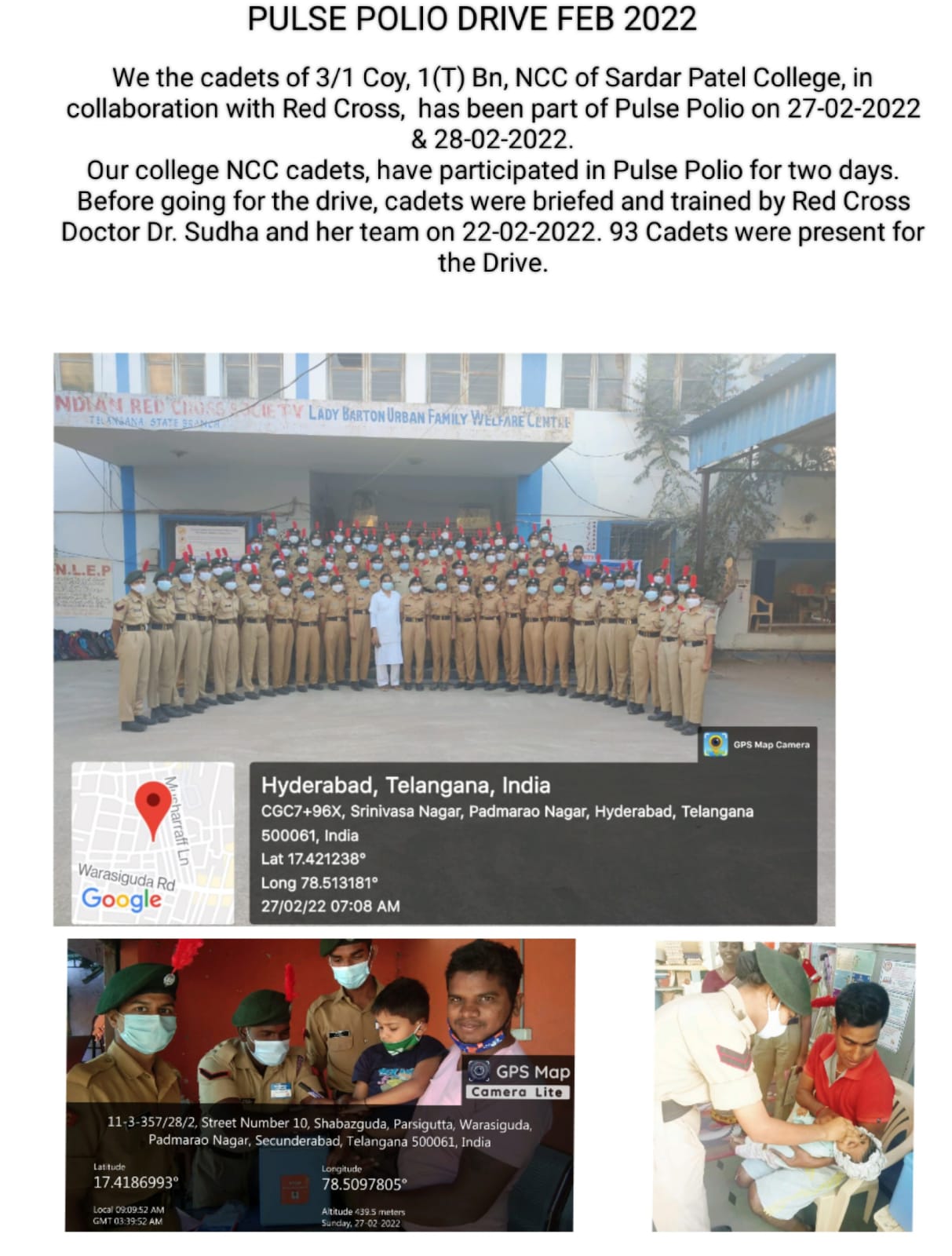 A total of 27 NCC cadets (15 SDs and 12 SWs) from our college raised awareness about World First Aid Day at Sardar Patel College premises on 14-09-2024, organized by Sardar Patel College 3/1 Coy, 1(Telangana) Battalion, Hyderabad Group, AP & T NCC Directorate."