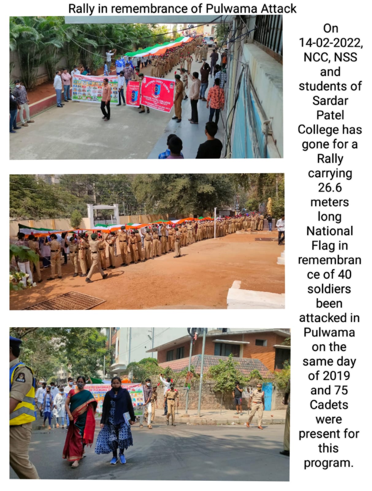 "World Environment Day is celebrated to encourage global awareness and action for the protection of our environment. It is a day to appreciate the beauty of nature. As part of World Environment Day, 15 cadets from our college participated in a rally at Necklace Road on 05-06-2024, representing Sardar Patel College, 3/1 Coy, 1(Telangana) Battalion, Hyderabad Group, AP & T NCC Directorate."