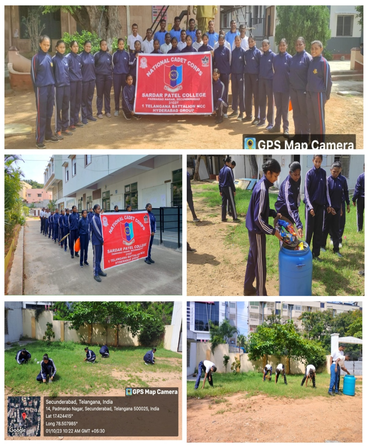 "We, the 3/1 Coy, 1(T) Bn, NCC of Sardar Patel College, conducted 'EK TAREEK, EK GHANTA, EK SAATH' as part of the Swachhata Hi Seva (SHS) programme on 01-10-2023 within the college premises."