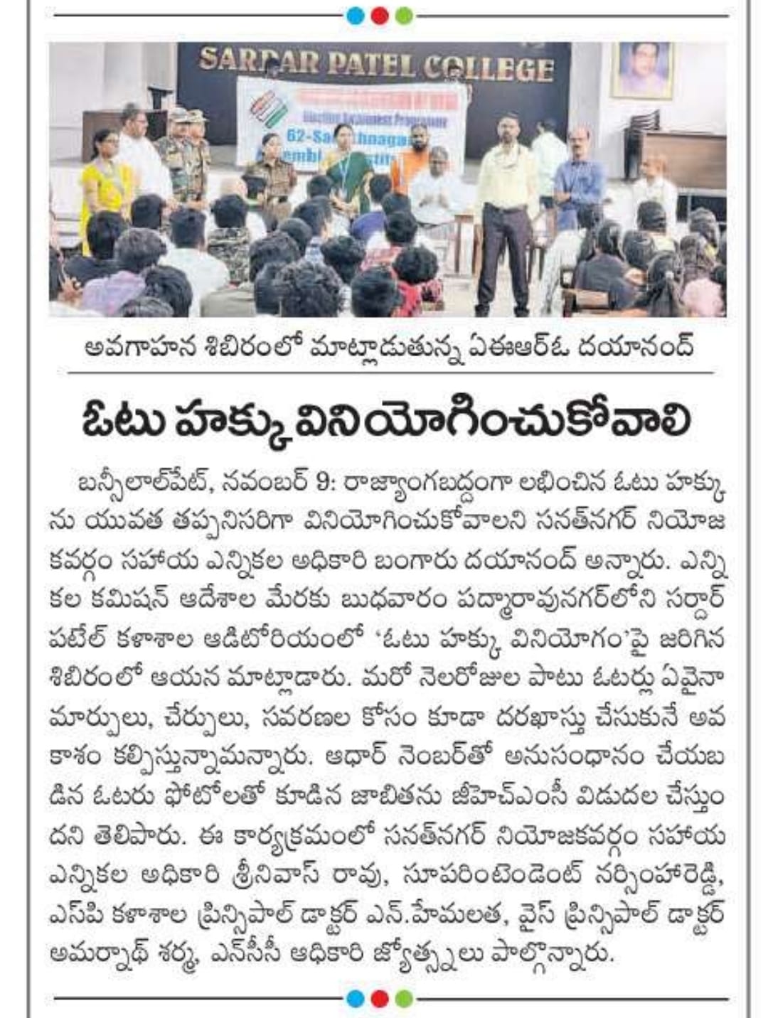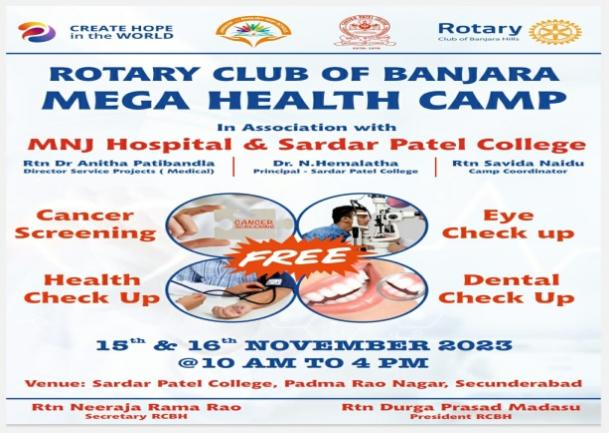 Sardar Patel College, in collaboration with the Rotary Club of Banjara and MNJ Hospital, conducted a Health Camp on 15th and 16th November 2023, on the college premises. The Health Camp offered free check-ups, including cancer screening, eye check-ups, dental check-ups, gynecology, and more.