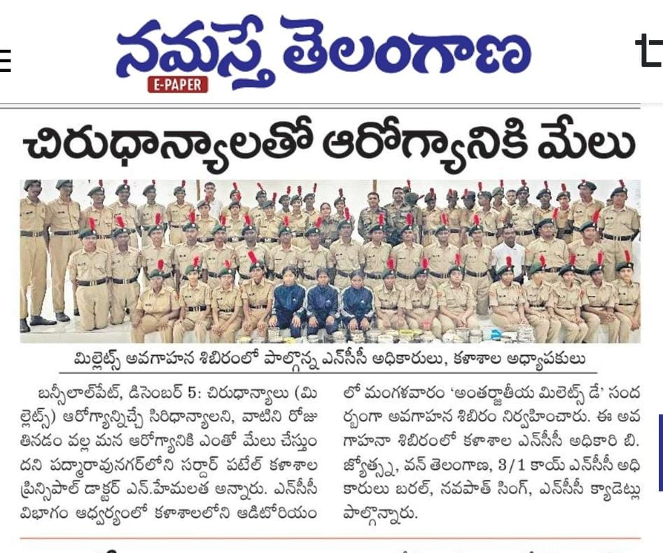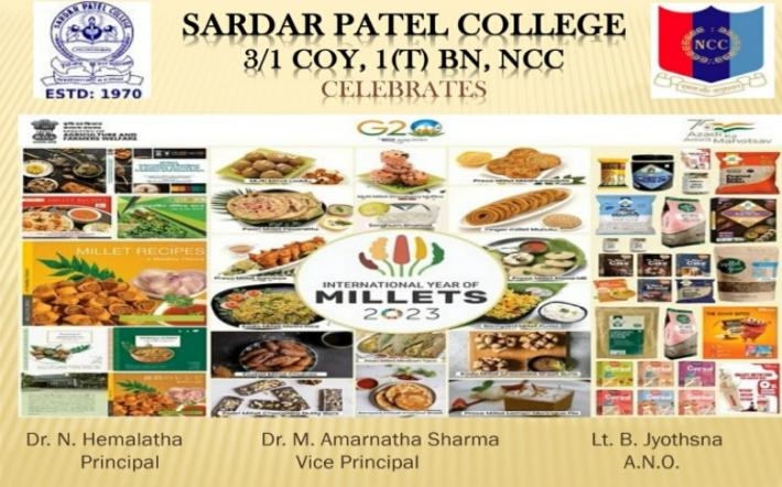 "On 05-12-2023, we, the 3/1 Coy, 1(T) Bn, NCC of Sardar Patel College, conducted a program on the International Year of Millets 2023. Principal Dr. N. Hemalatha, Vice Principal Dr. M. Amarnatha Sharma, Academic Coordinator & Head of the Department of Chemistry Dr. Neelima, Heads of the Departments of Zoology, Botany, and Nutrition Rajini, ANO Lt. B. Jyothsna, PI Staff CHM Baral, Hav Narpat Singh, college staff, and 80 NCC cadets participated in the program. The event highlighted the importance of millets in our daily lives through speeches by the Vice Principal, Academic Coordinator, Heads of the Departments, and cadets. Videos on the same topic were also played."