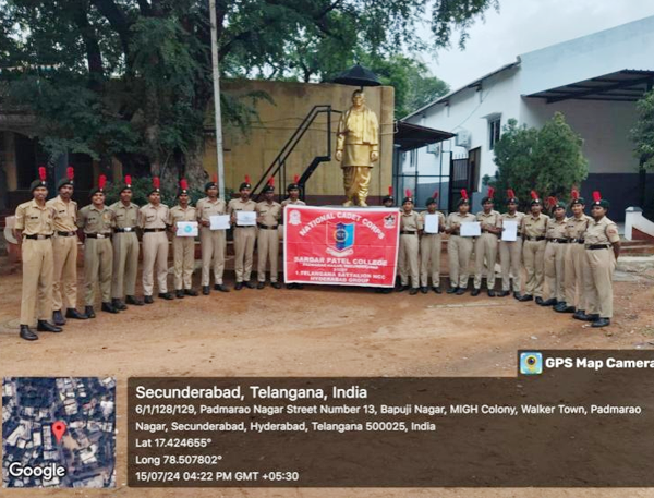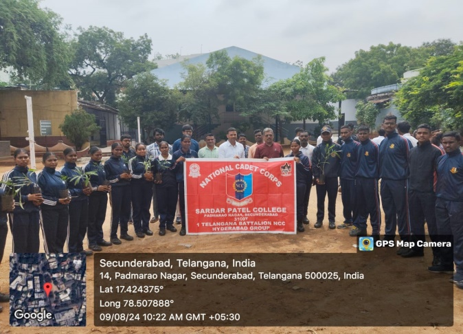 A total of 25 cadets (14 SDs and 11 SWs) participated in the Tree Plantation Drive at Sardar Patel College premises on 09-08-2024, organized by Sardar Patel College 3/1 Coy, 1(Telangana) Battalion, Hyderabad Group, AP & T NCC Directorate."